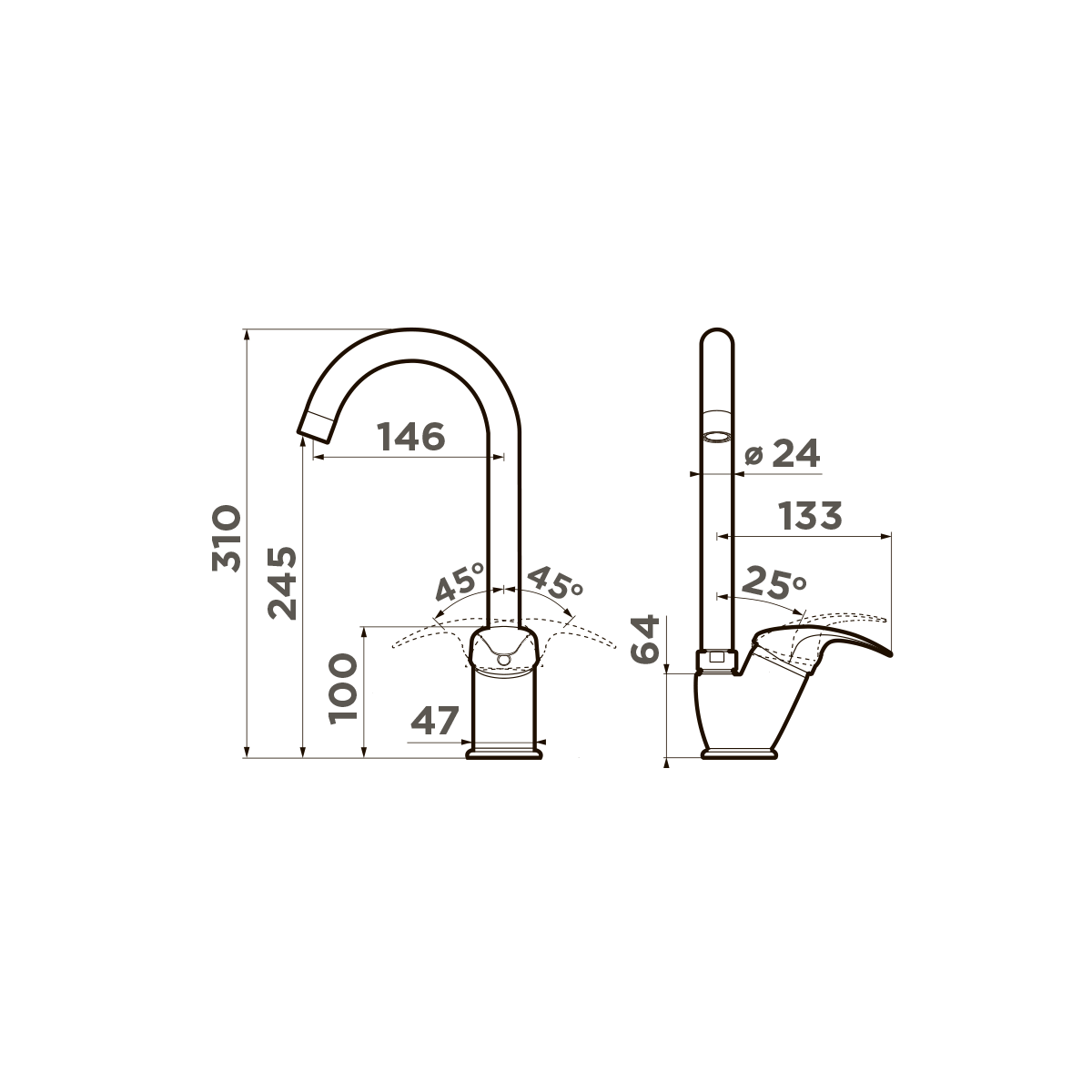 - Смеситель выполнен в современном стиле и снабжен высоким поворотным изливом;